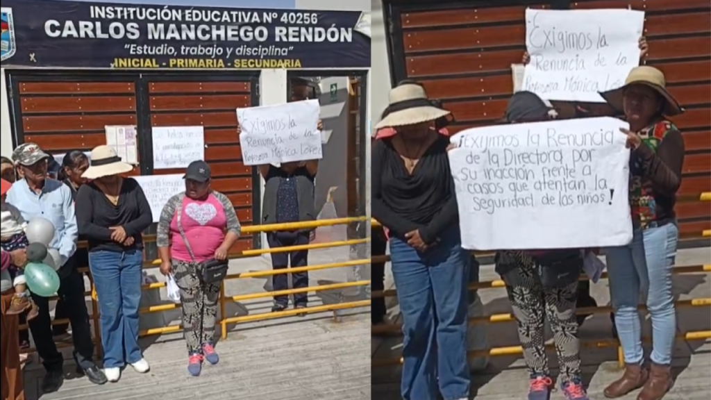 Padres de familia del colegio Carlos Manchego Rendón (I.E. 40256), en el distrito de Socabaya, realizaron esta mañana un plantón para exigir la expulsión inmediata