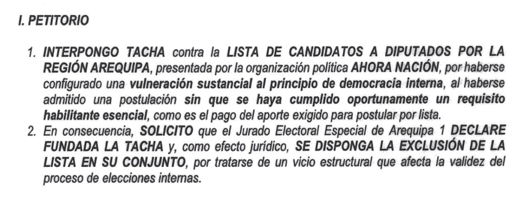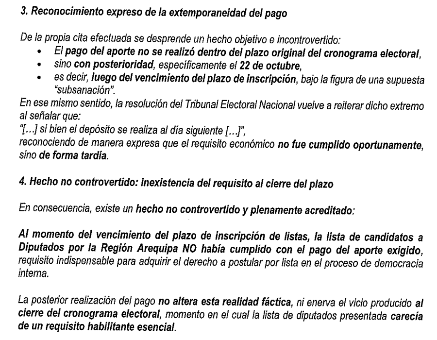 En este último documento se alegó que la nómina fue presentada fuera del cronograma establecido para las elecciones internas y que el pago del aporte también se habría efectuado de manera extemporánea, motivo por el cual -considera- los candidatos deberían ser excluidos del proceso electoral.