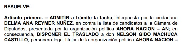 Sostiene que este hecho fue reconocido por el Tribunal Electoral Nacional (TEN) de Ahora Nación tras resolver un recurso presentado por un militante del mismo partido contra la inscripción de la lista de precandidatos a diputados por Arequipa.