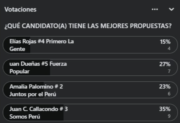 Participaron los postulantes a diputado: Juan Elías Rojas Paredes N° 4 por Primero la Gente, Juan Carlos Callacondo Velarde N° 3 por Somos Perú, Amalia Emilia Palomino Pacheco N°2 por Juntos por el Perú y Juan Andrés Dueñas Escobar N° 5 por Fuerza Popular.