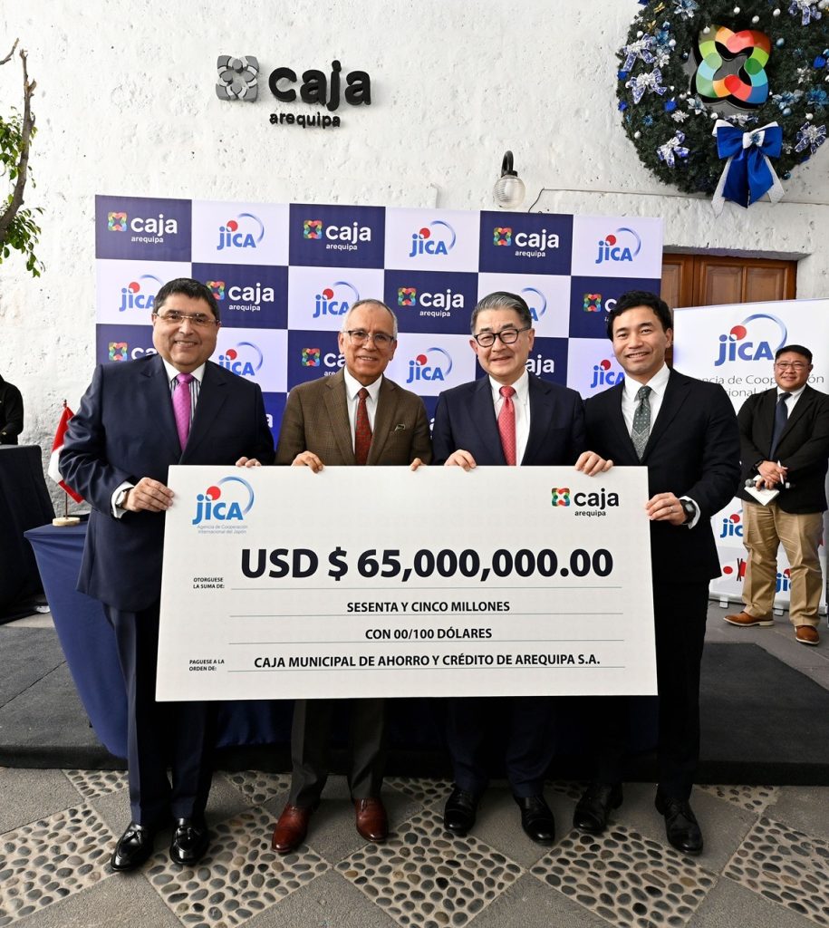 Con la entrega simbólica de un cheque, Caja Arequipa y la Agencia de Cooperación Internacional del Japón (JICA) suscribieron en la Ciudad Blanca un contrato de financiamiento por hasta US$ 65 millones destinados a fortalecer las iniciativas de Caja Arequipa que impulsen el desarrollo de miles de mujeres emprendedoras en el Perú.
