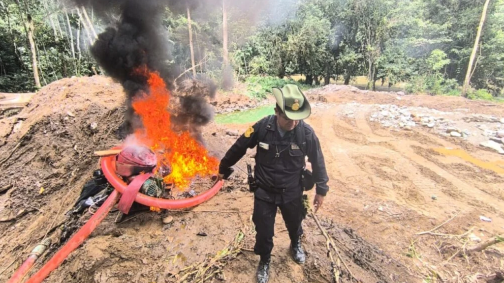 En el lugar los efectivos policiales destruyeron un generador eléctrico, un motor chino, tanques de gasolina y gas; una estructura metálica (balsa para draga) y otros insumos usados para la extracción ilegal de los minerales, en total valorizados en S/2 325 560.