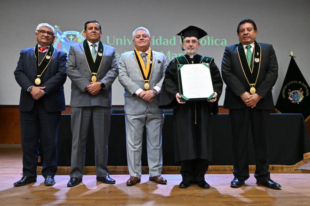 En una ceremonia solemne, la Universidad Católica de Santa María (UCSM) confirió el grado de Doctor Honoris Causa al arzobispo de Arequipa, Monseñor Javier Del Río Alba, en reconocimiento a su destacada trayectoria en el ámbito eclesial, académico y cultural.