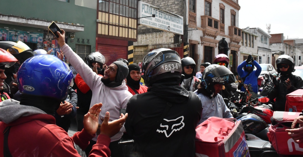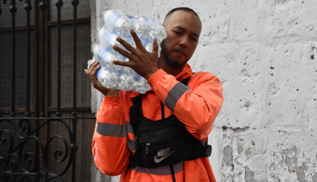 En caravana subieron hasta la parte alta del distrito de Cayma con sus mochilas llevaban un letrero que decía “deliverys por Arequipa”. Repartieron botellas de aguas y alimentos no perecibles a las familias.