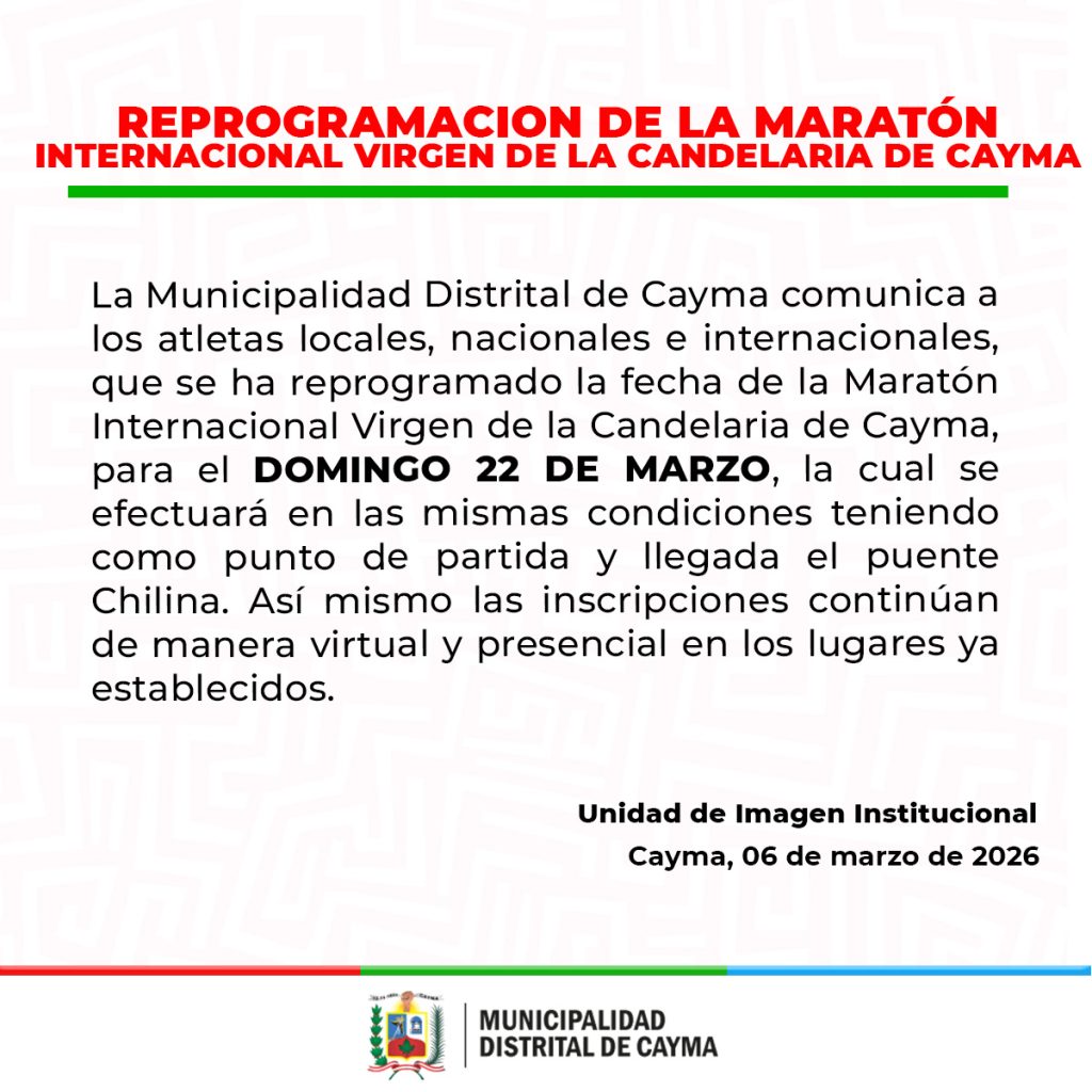 La tradicional Maratón Internacional Virgen de la Candelaria Cayma 2026 en su edición n°. 39, fue reprogramada para el domingo 22 de marzo desde las 6:30 horas. El recorrido comenzará y terminará en el puente Chilina de Cayma (Arequipa), por lo que ese día se cerrarán sus dos carriles. Asimismo, el trayecto atravesará 12 distritos y será supervisado por más de 50 jueces de ruta.