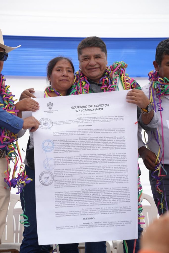 La Municipalidad Provincial de Arequipa ha dado un paso decisivo en el saneamiento físico legal de la Asociación de Vivienda Villa Esperanza -Tiabaya mediante la entrega del Acuerdo de Concejo N° 102-2025. Con esta incorporación, ya son 36 los pueblos y asociaciones en toda la provincia que se encuentran en la ruta hacia la formalización, una medida que busca regularizar la situación de miles de familias que ocupan terrenos de manera informal.