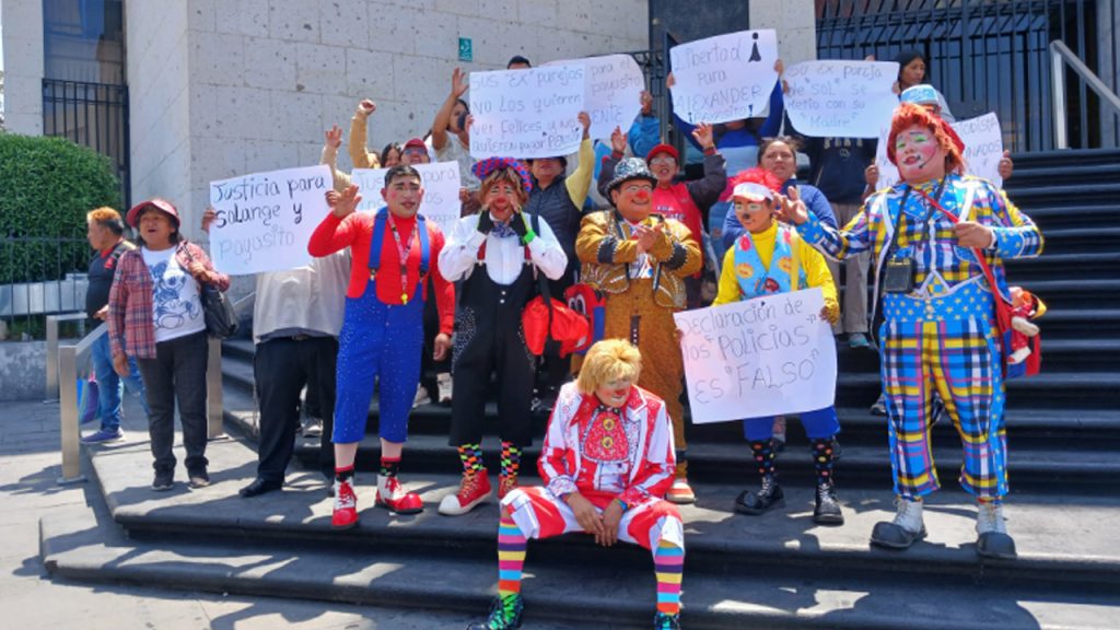 Payasos y allegados a la pareja acusada de presuntamente obligar a sus cuatro menores hijos a vender chocotejas en la calle, realizaron este viernes un plantón frente a la sede de la Corte Superior de Justicia de Arequipa.