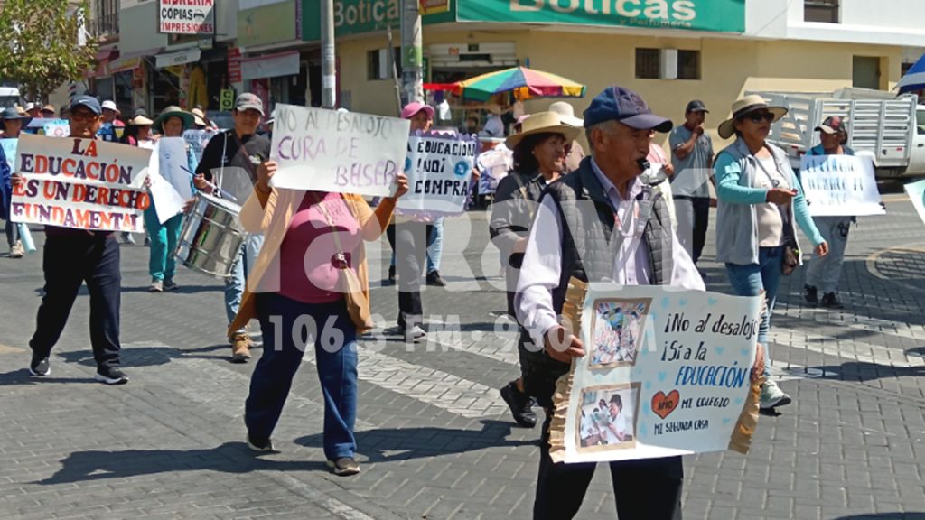 Decenas de padres de familia y exalumnas de la institución educativa Nuestra Señora de los Dolores, en Cerro Colorado, realizan este jueves una marcha de protesta ante la posible ejecución de un desalojo que afectaría a más de 500 estudiantes.