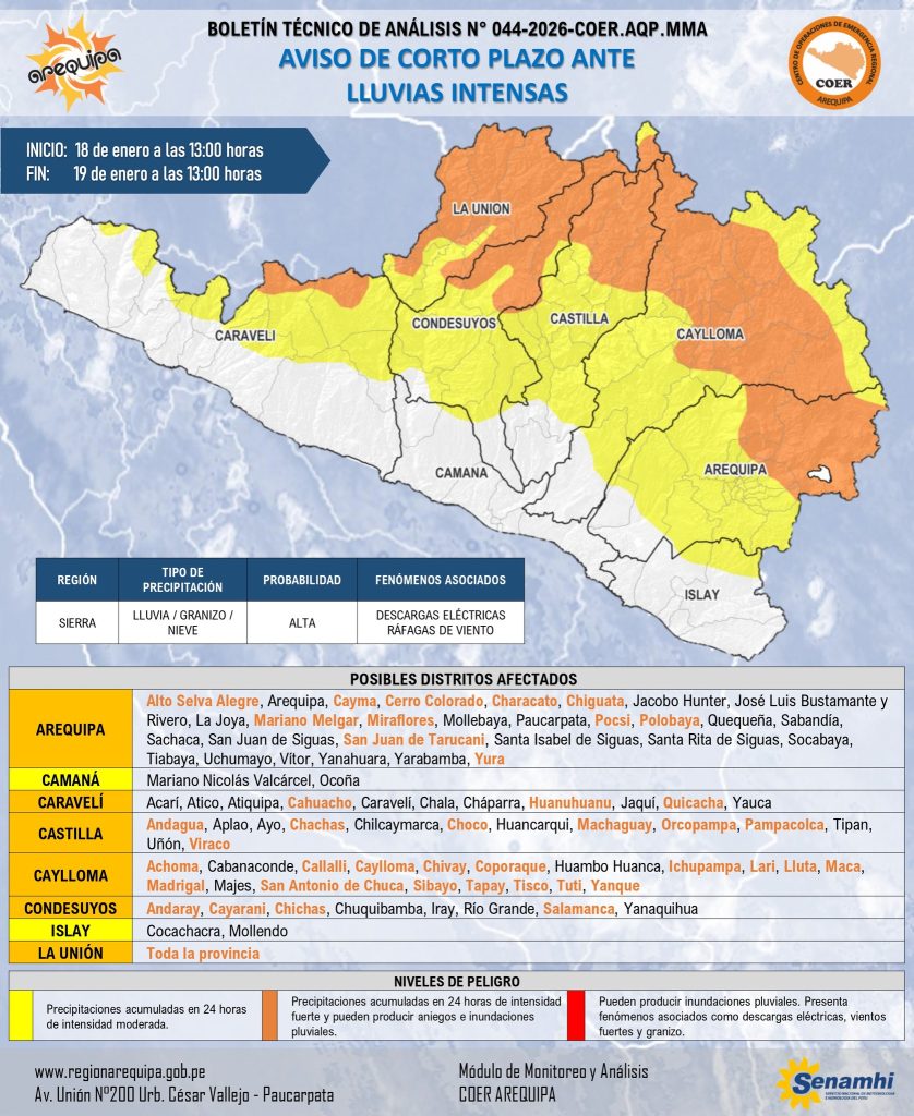 Hasta el cierre de esta nota, no se ha precisado el número de personas damnificadas por las precipitaciones. Sin embargo; el Servicio Nacional de Meteorología e Hidrología (Senamhi) emitió un aviso meteorológico de corto plazo, vigente desde la 1:00 p. m. del sábado 18 de enero hasta la 1:00 p. m. del lunes 19 de enero, advirtiendo que las lluvias continuarán en la región.