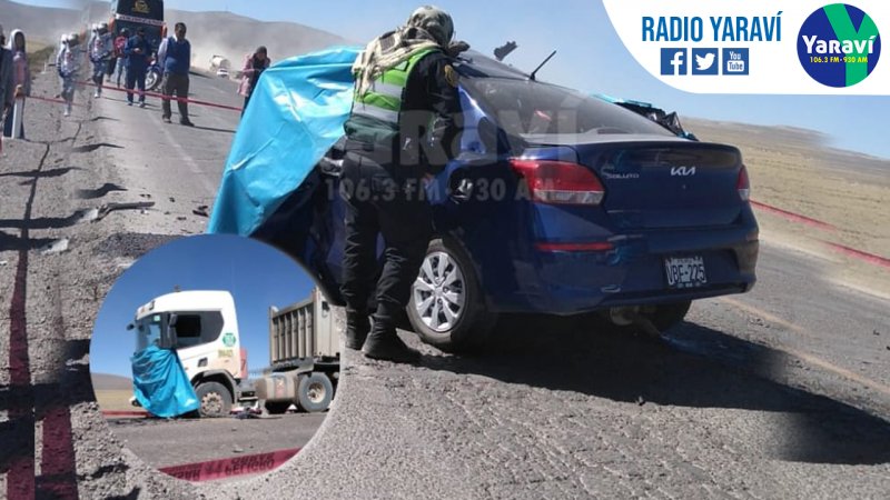 El choque se dio entre un colectivo que se dirigía hacia en dirección de la carretera de Juliaca-Arequipa, con un camión que iba en sentido contrario. El auto azul de placa VBF-225 quedó completamente destrozado, mientras que el vehículo mayor de matrícula BMA-823 terminó con la parte delantera hecha trizas.